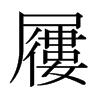 [①][jù][《廣韻》九遇切,去遇,見。]“屦1”的繁体字。(1)单底鞋。多以麻、葛、皮等制成。后亦泛指鞋。(2)穿鞋。(3)脚上着物。参见“屨校”。(4)踩踏。(5)任,担任。